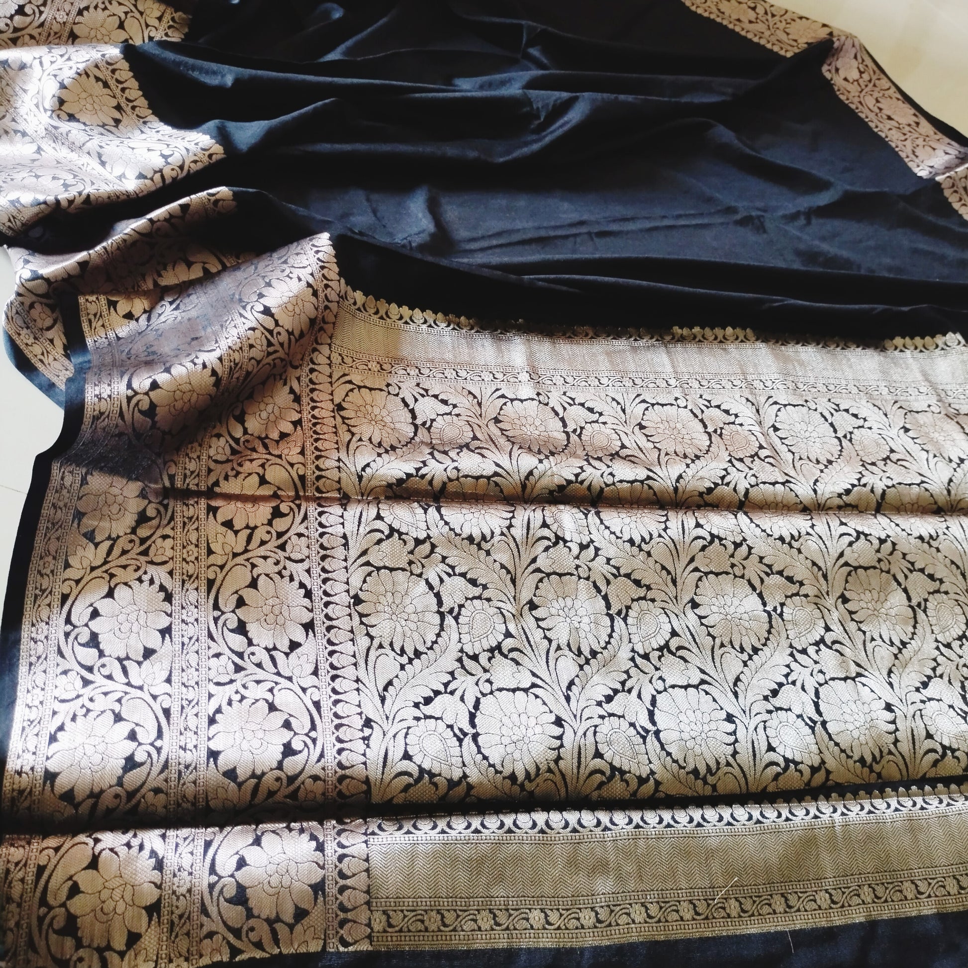 A masterpiece of sophistication, this black Banarasi warm silk saree is adorned with opulent silver zari weaving that flows across the border and pallu in intricate floral and vine patterns. The deep black base enhances the brilliance of the zari, creating a striking contrast that exudes timeless grandeur.