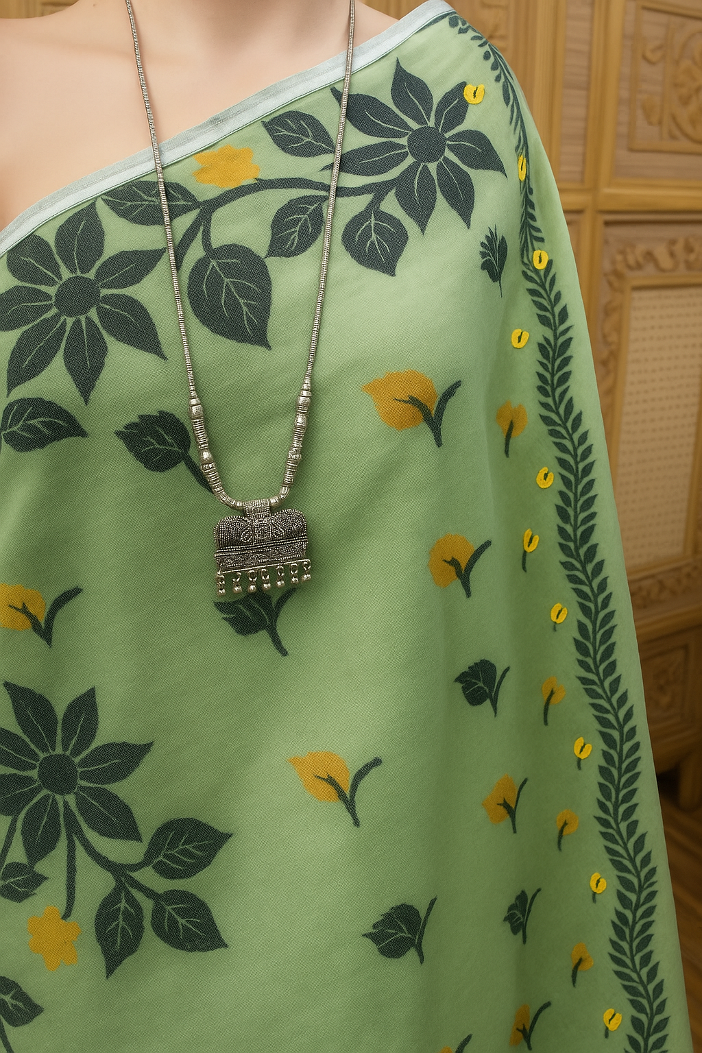 This refreshing green linen Lata Jamdani saree is adorned with delicate handwoven floral butis in yellow and white, complemented by a leafy border. Lightweight, airy, and elegant, it is perfect for casual gatherings, festive wear, or office styling. A timeless weave that blends tradition with everyday charm.