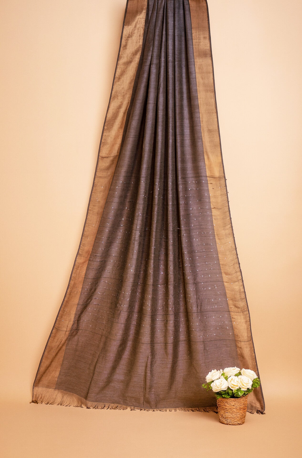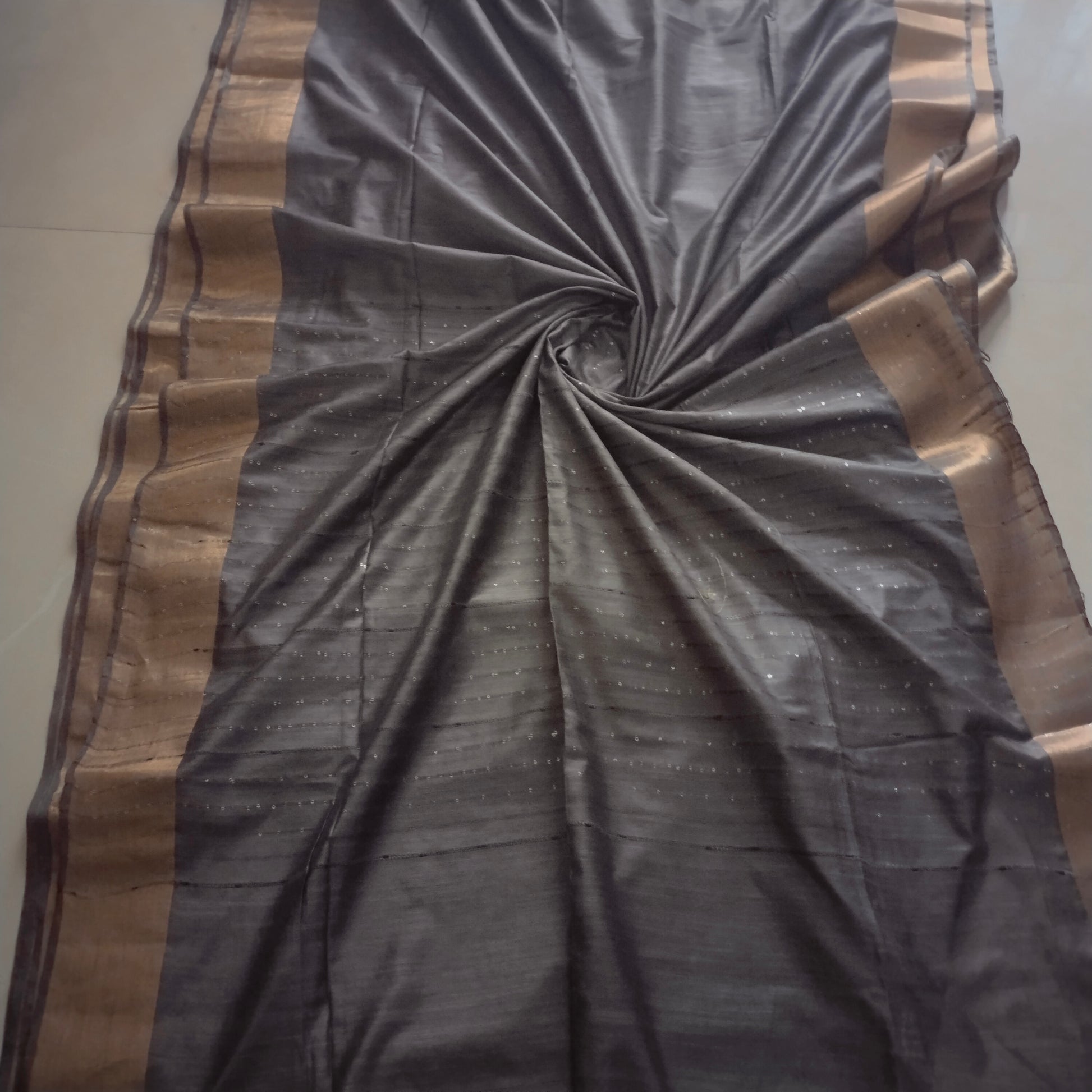 Elevate your traditional attire with this Kota Staple saree in a smokey grey shade, featuring a subtle copper-toned zari border. Lightweight and comfortable, it drapes gracefully while maintaining a refined, classic look. The saree comes with a running blouse piece, making it suitable for festive occasions, cultural gatherings, and elegant everyday wear.