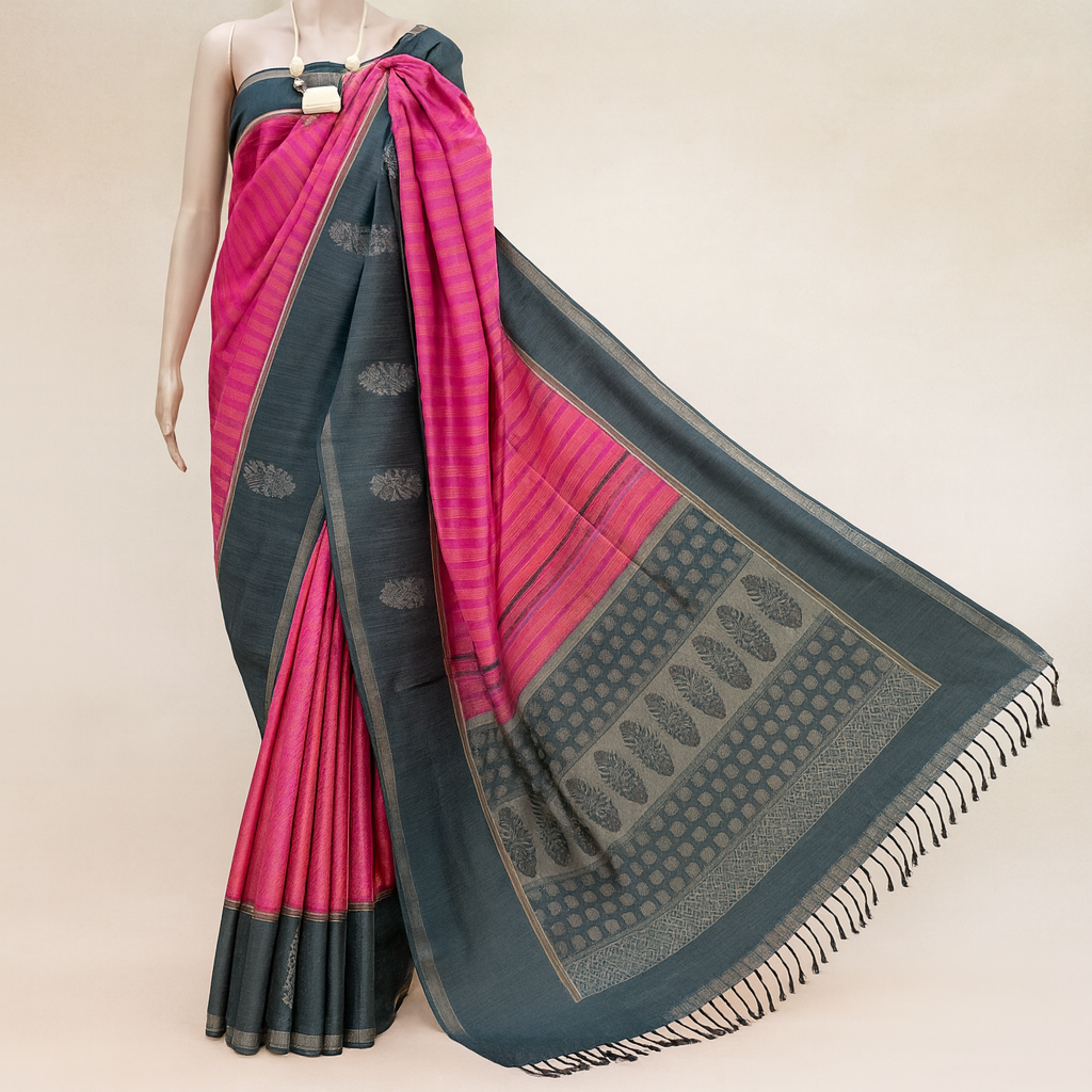 This elegant linen-cotton saree is crafted for effortless comfort and style. Lightweight, soft, and breathable, it drapes beautifully for all-day wear. The saree features a striking combination of deep grey with a vibrant pink body, enhanced by delicate printed motifs and a contrasting border. Perfect for work, casual gatherings, or festive occasions, it blends traditional charm with contemporary appeal.