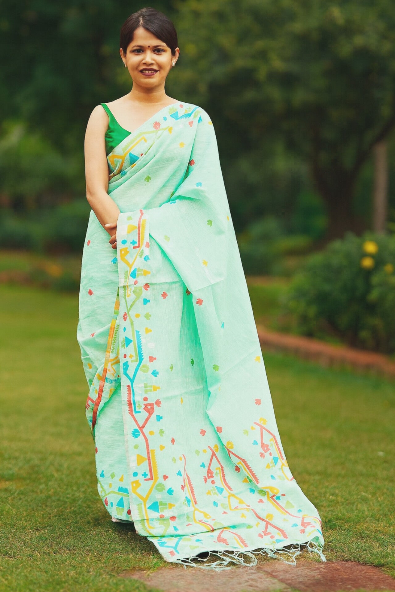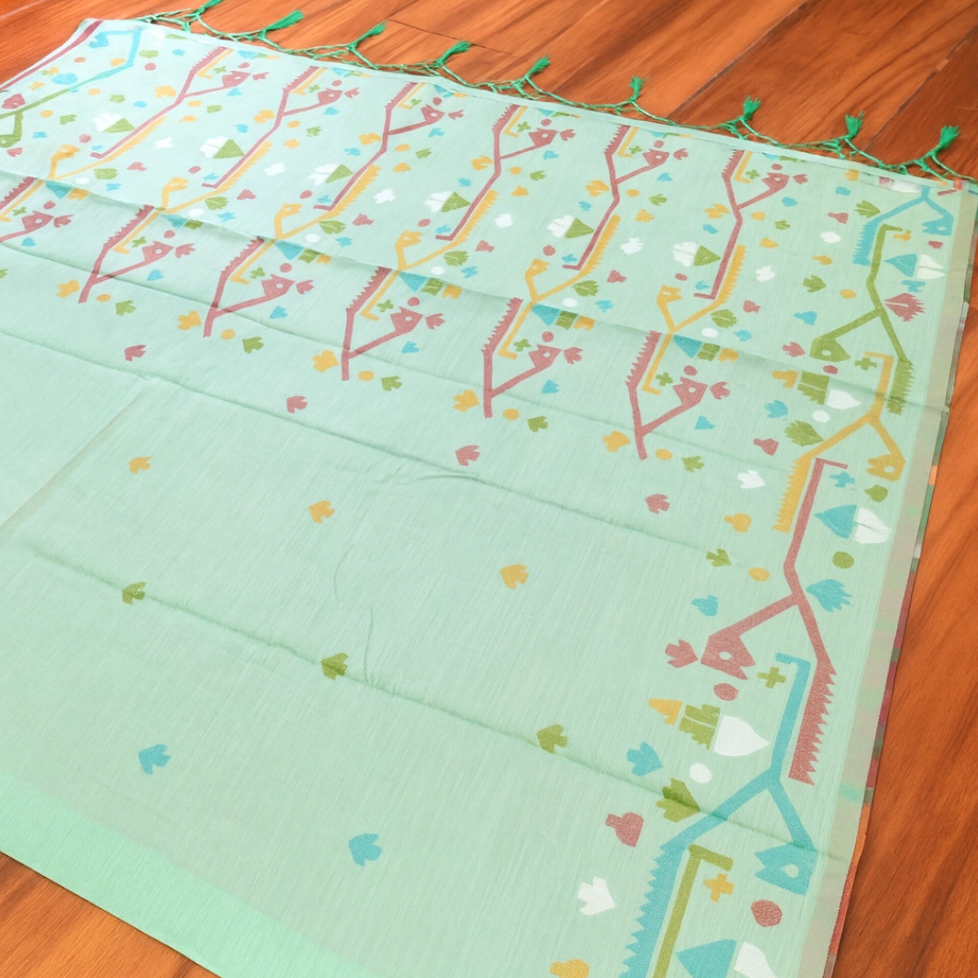 Lightweight Linen Jamdani Saree in soothing pastel green, adorned with multicolour geometric and floral Jamdani motifs. Finished with tassel detailing on the pallu and paired with a contrasting maroon blouse piece, this saree is perfect for effortless elegance and everyday comfort.”