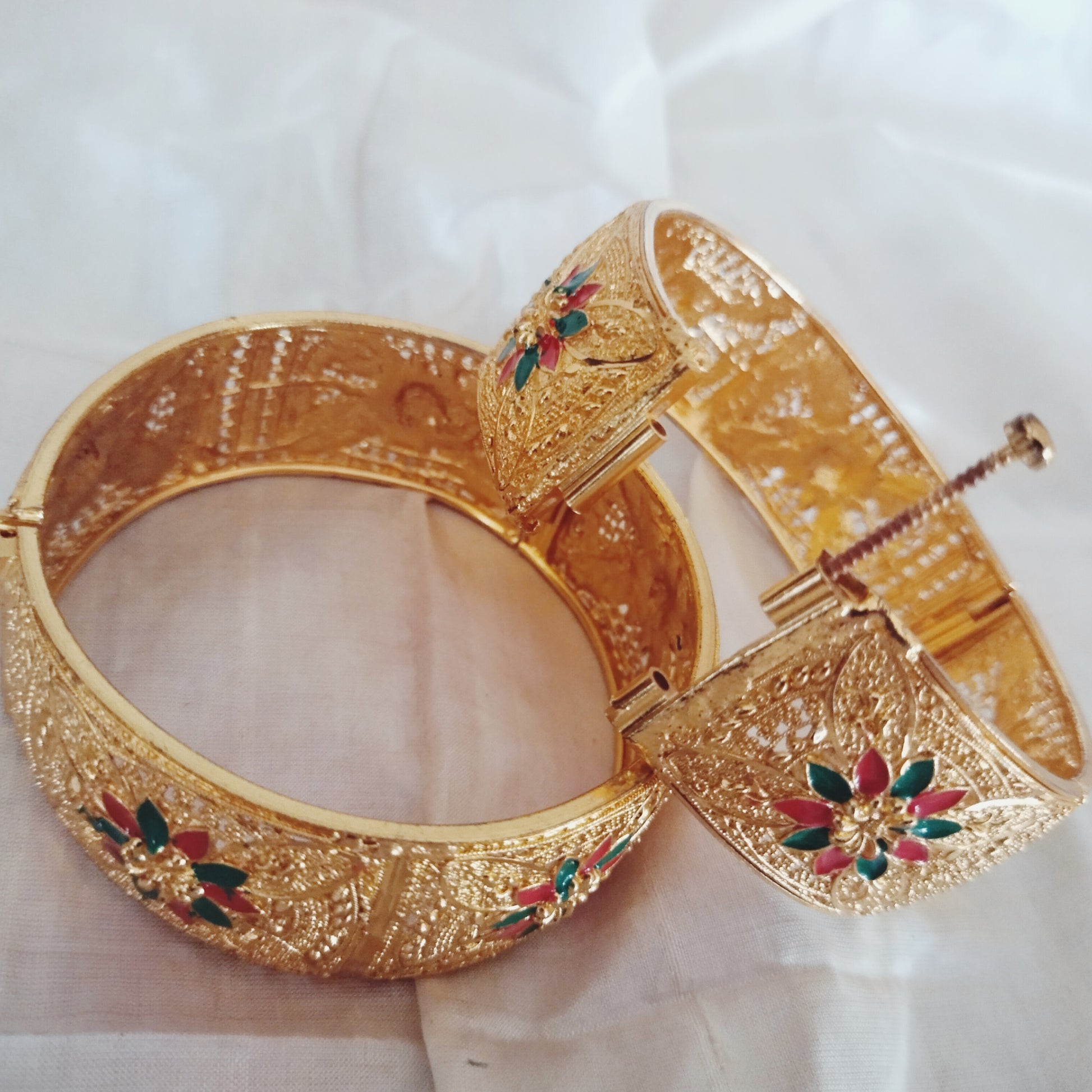 Exquisite gold-finish bangles featuring intricate floral designs with vibrant red and green enamel detailing. Perfect for weddings, festive occasions, and traditional wear, these bangles add a timeless charm to your look."