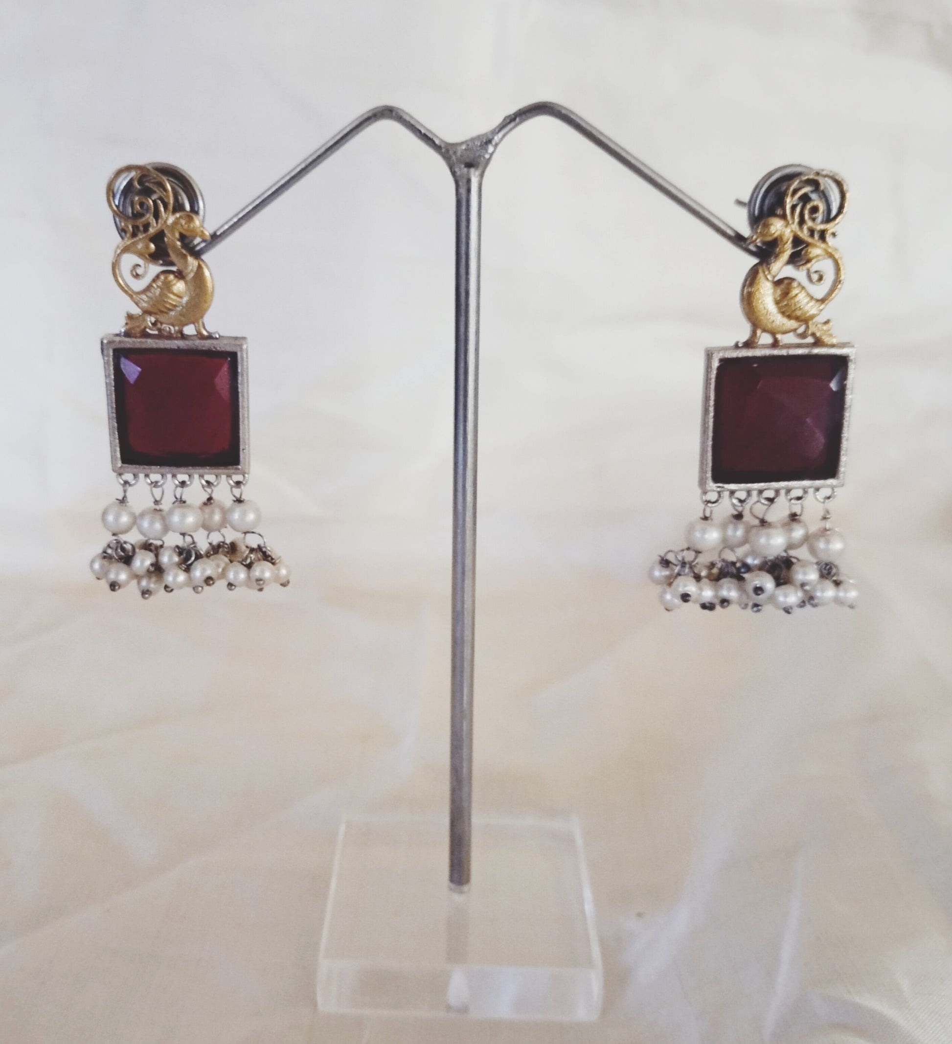 These exquisite earrings blend tradition and elegance, featuring deep maroon square stones beneath ornate golden peacocks. Dangling clusters of delicate white pearls add graceful movement and charm. Perfect for festive occasions or ethnic attire, the Regal Pearl Drop is a timeless statement piece with rich cultural detailing.