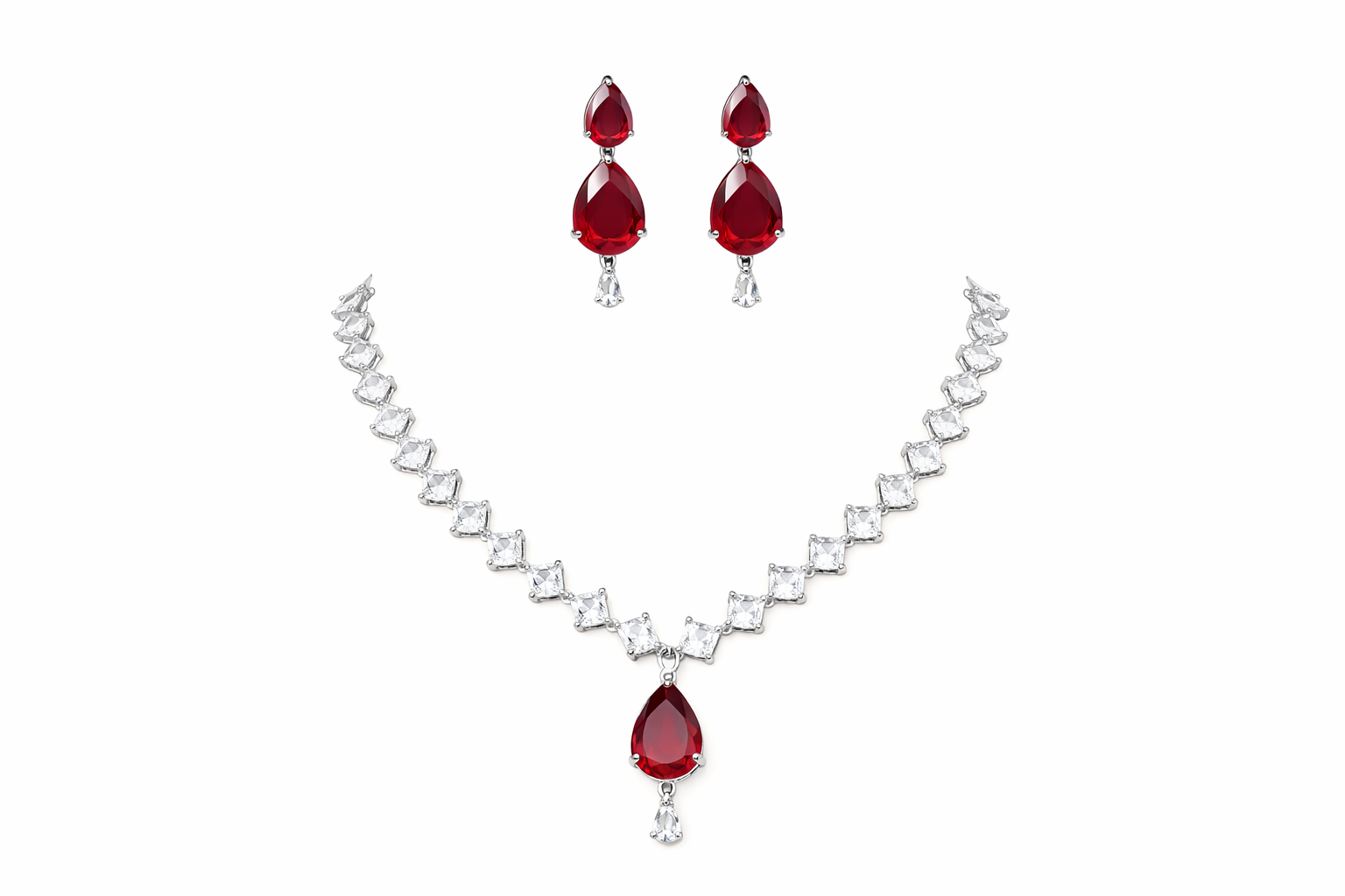 Elegant silver-tone necklace set featuring sparkling AD stones with a bold ruby-red teardrop pendant and matching earrings. Perfect for party wear and special occasions. ❤️✨