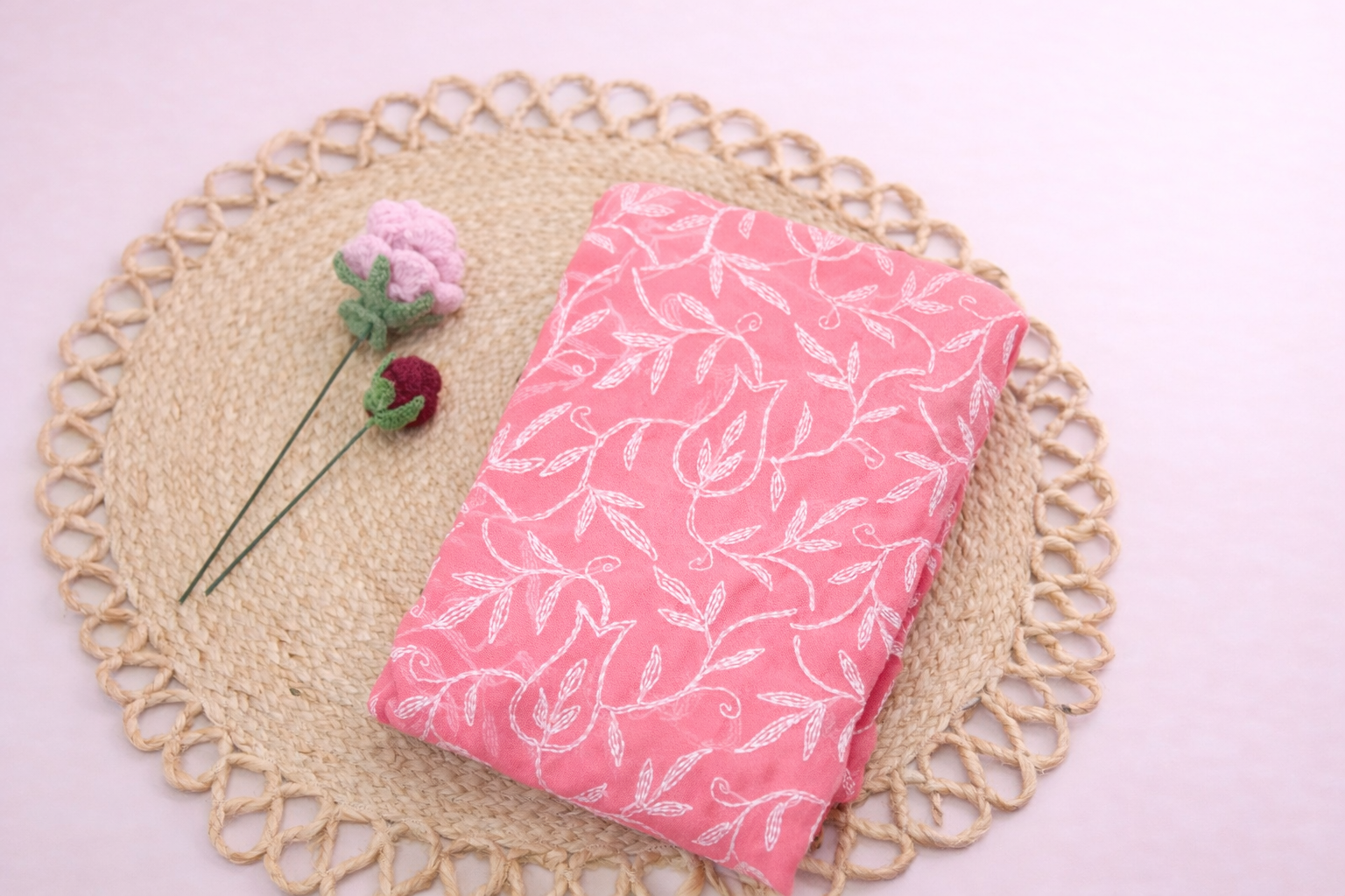 Beautiful coral pink Lucknowi Tepchi saree crafted in lightweight georgette, adorned with delicate white thread embroidery. Soft, graceful, and perfect for everyday elegance with a touch of charm.
