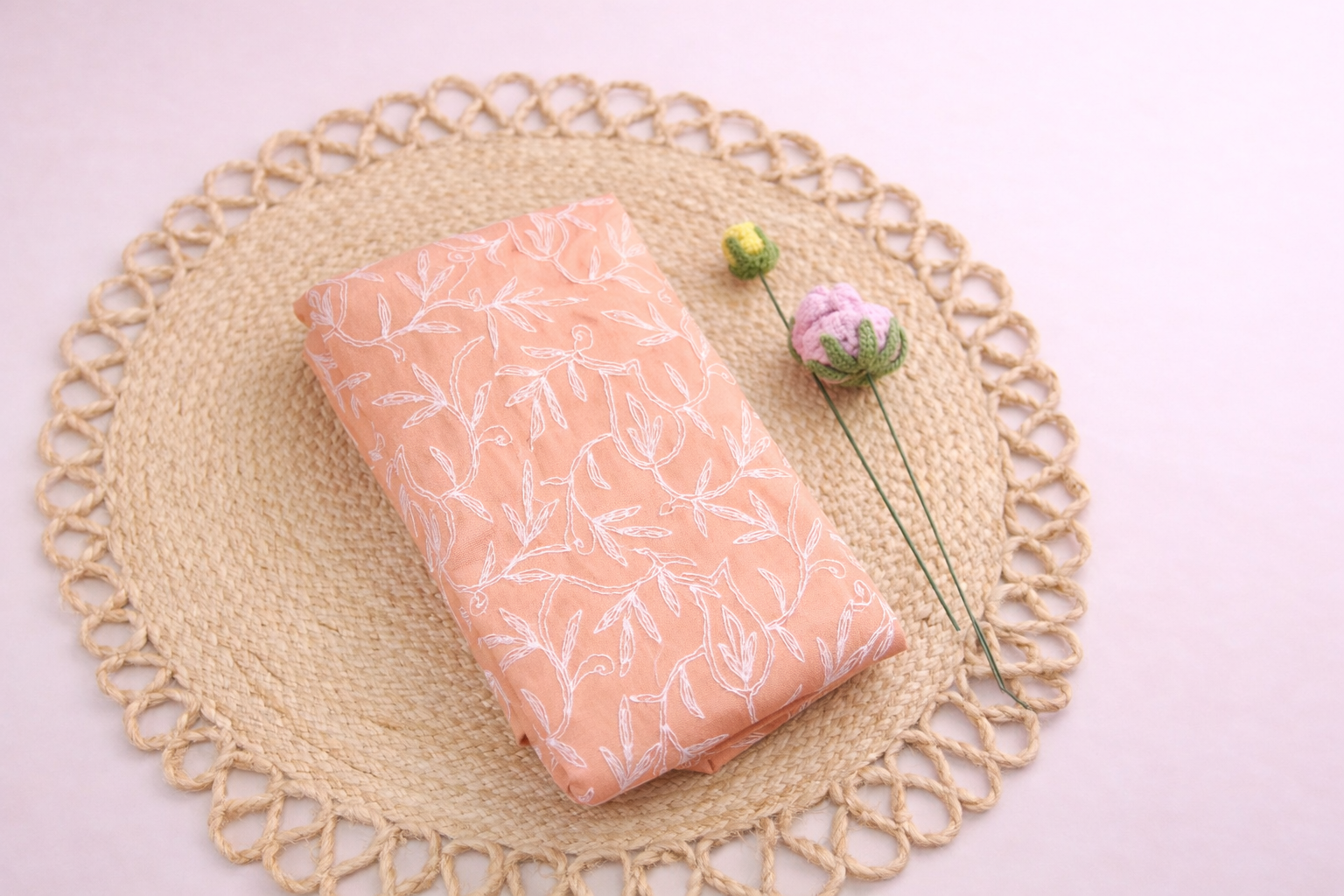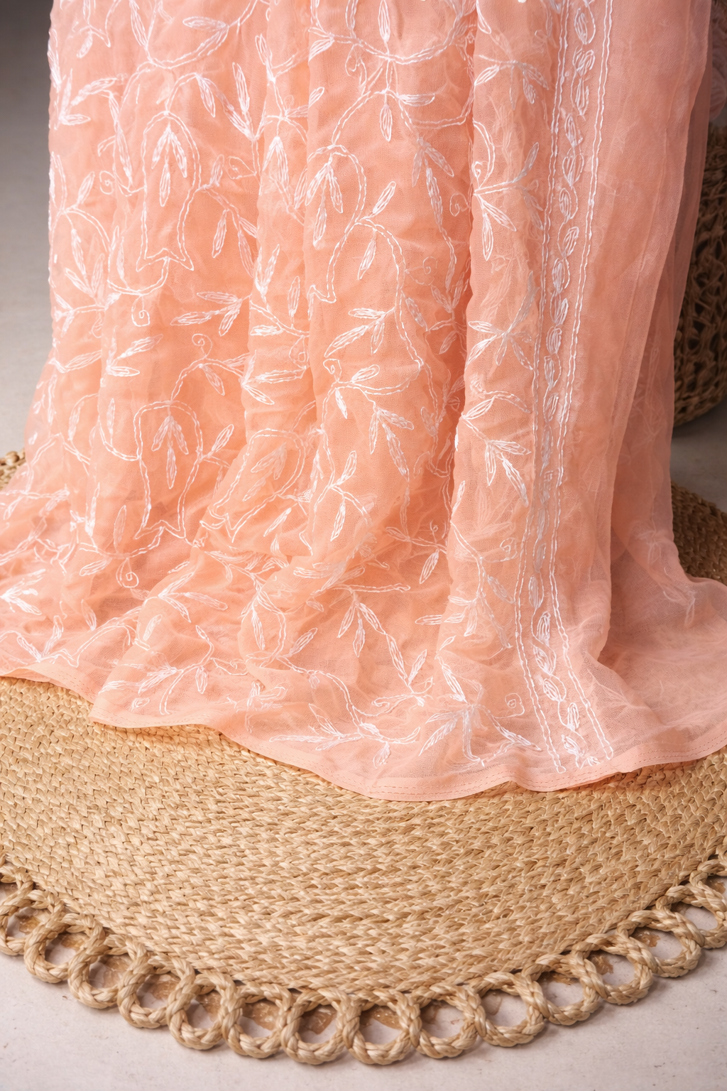 Elegant peach Lucknowi Tepchi saree crafted in lightweight georgette, adorned with delicate white thread embroidery. Soft, graceful, and perfect for a subtle, sophisticated everyday look.