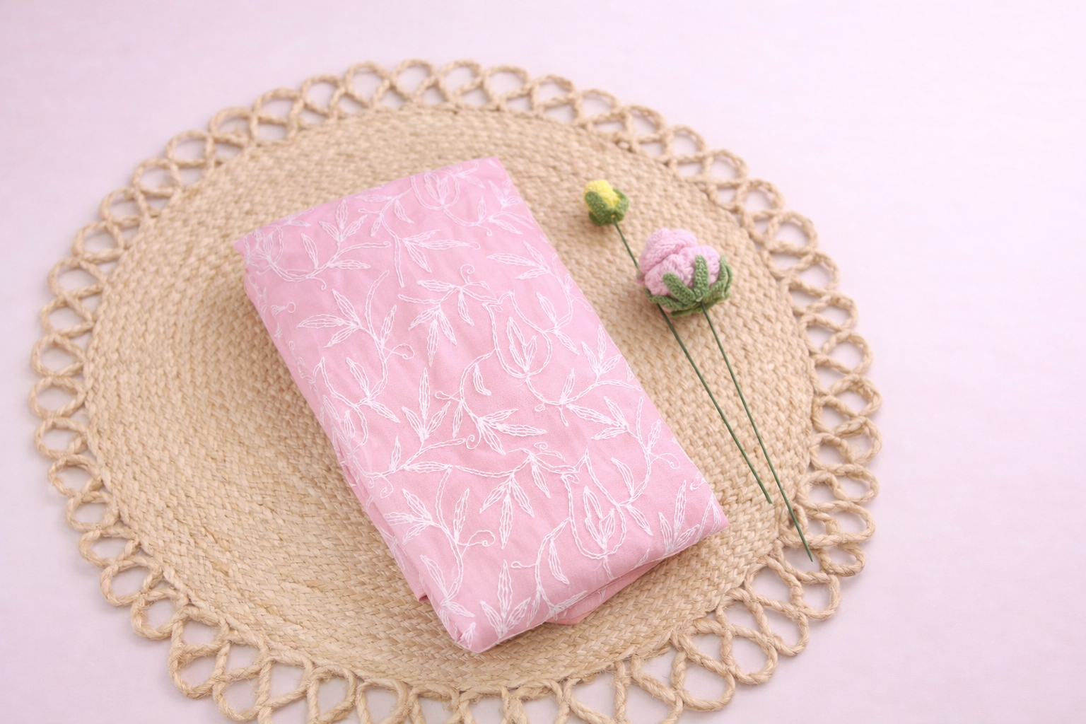 Elegant baby pink Lucknowi Tepchi saree crafted in lightweight georgette, beautifully detailed with delicate white thread embroidery. Soft, feminine, and perfect for a graceful everyday or subtle festive look.
